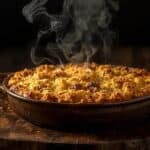Hearty family-style casserole with ground beef, pasta, bacon, and melted cheese.