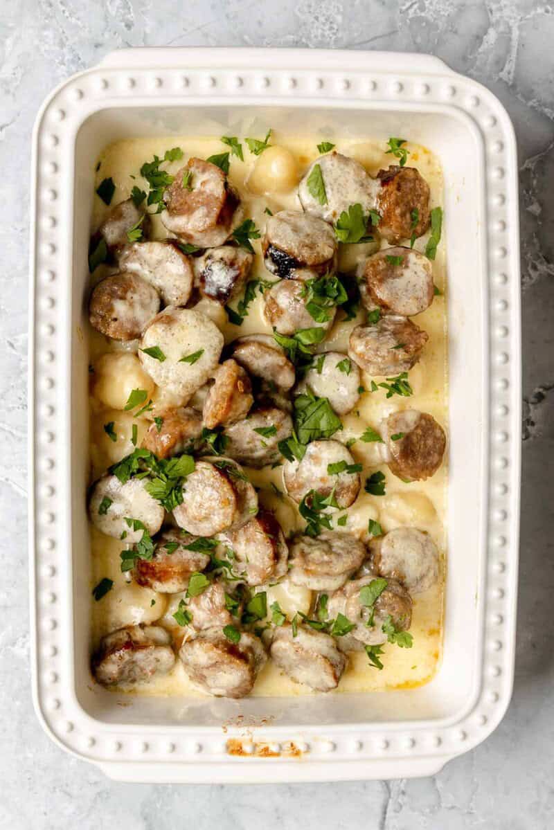 - Preheat oven to 375 degrees. In a large skillet add butter place skillet over medium heat. When the butter has melted and just begins to bubble add heavy cream, stir until the cream has blended and is warm. When the cream is warm add cheese and nutmeg. Turn up the heat just a little more. Stir until the sauce thickens. Place gnocchi in a 13 by 9-inch pan. Add sliced sausage to pan.