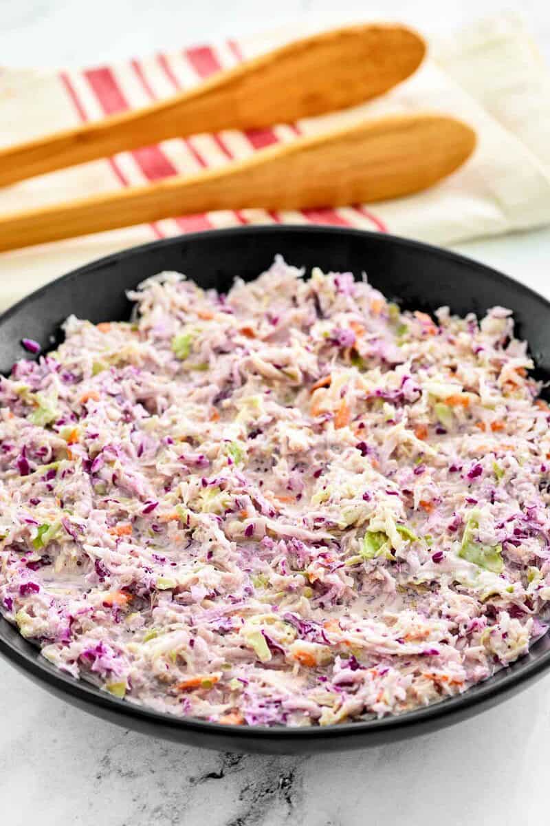 - Add the dressing to the slaw and toss until thoroughly coated.