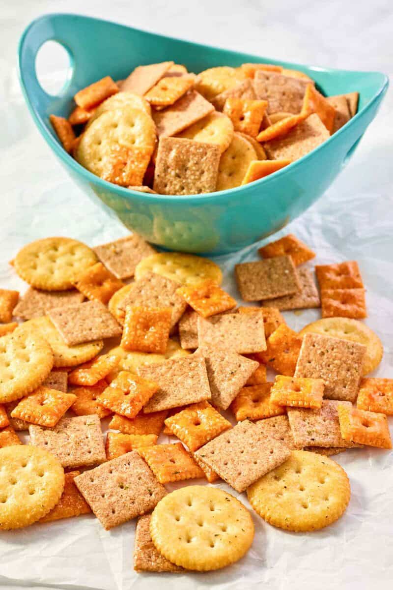 - Add 36 ounces of crackers into a large bowl, and stir to combine the crackers.