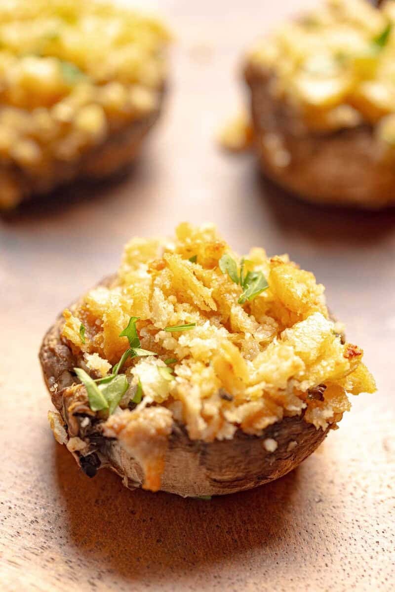 - Stuff each mushroom with the stuffing mixture and place them in a baking dish in a single layer.